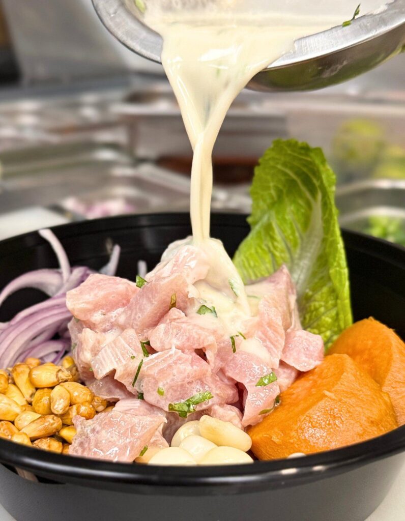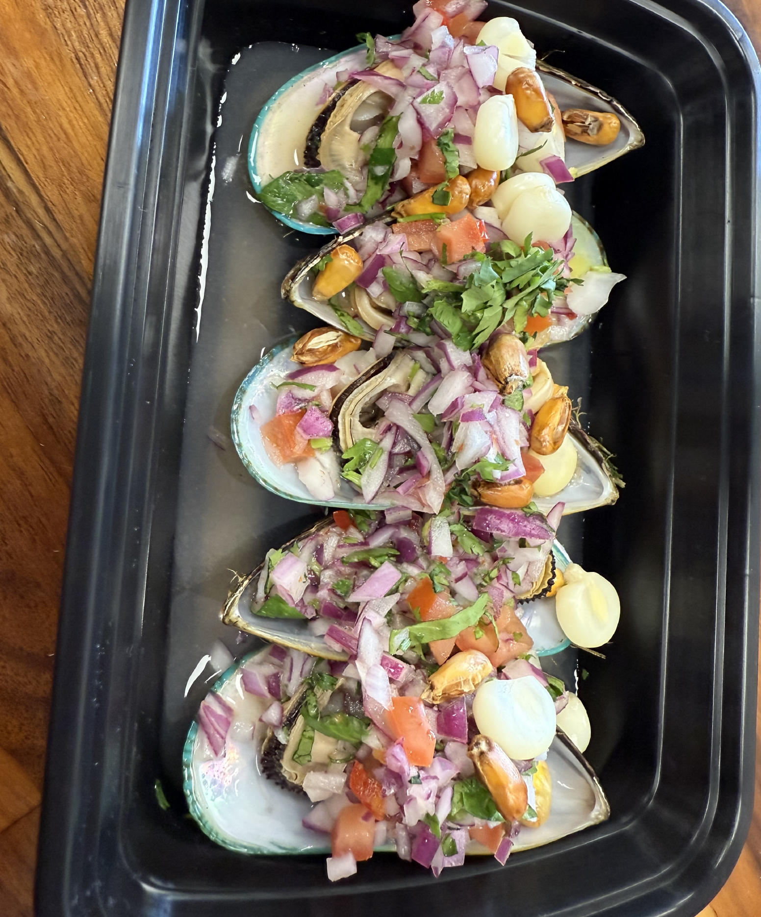 Steamed mussels served on the half shell and topped with a fresh Peruvian salsa made of red onions, tomatoes, Peruvian corn, corn nuts, cilantro, and lime juice.