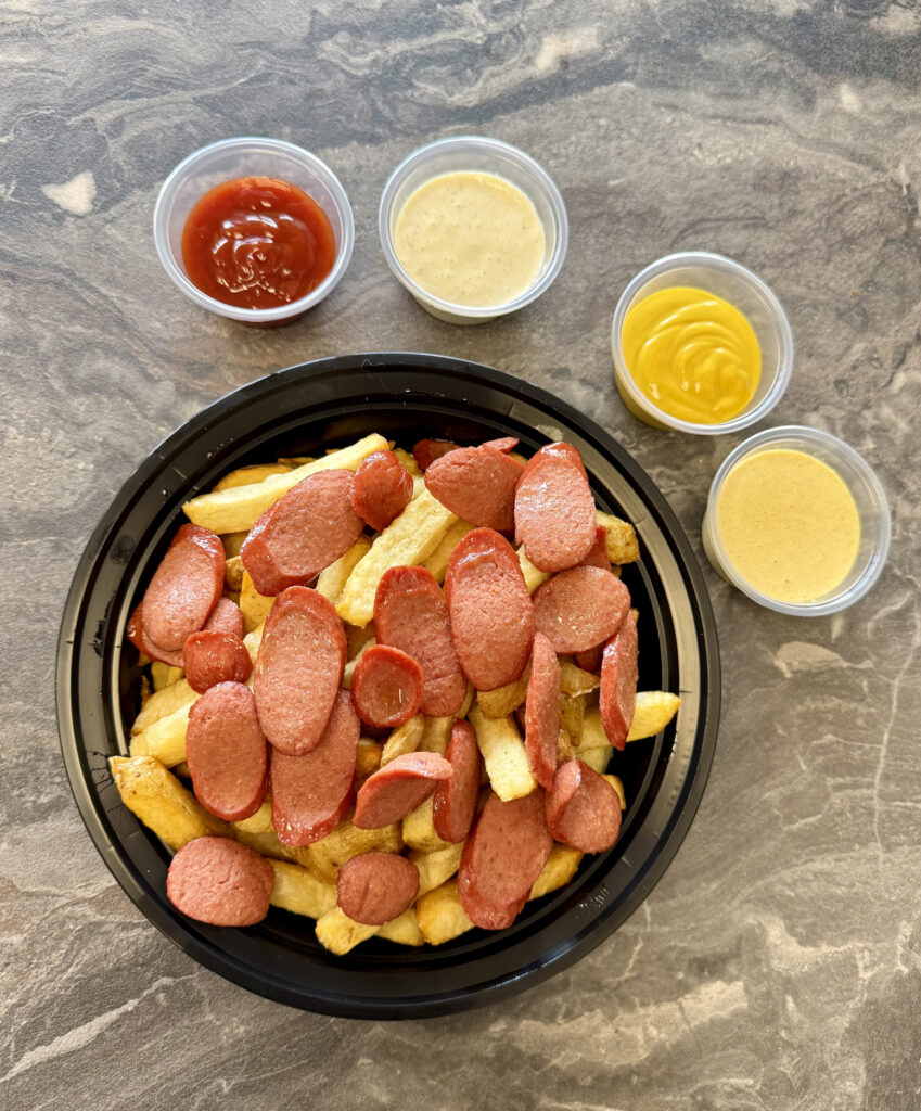 Sliced beef hot dogs served over French fries, topped with fried egg and rotisserie chicken. Served with house sauces on the side.